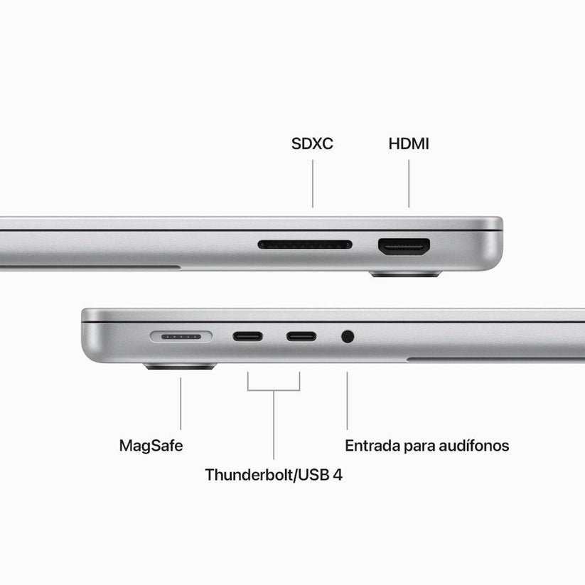 CONECTA TODO — Este MacBook Pro viene equipado con un puerto de carga MagSafe, dos puertos Thunderbolt/USB 4, una ranura para tarjeta SDXC, un puerto HDMI y entrada para audífonos. Además, ofrece una rápida conectividad inalámbrica, con Wi-Fi 6E y Bluetooth 5.3, y admite un monitor externo.