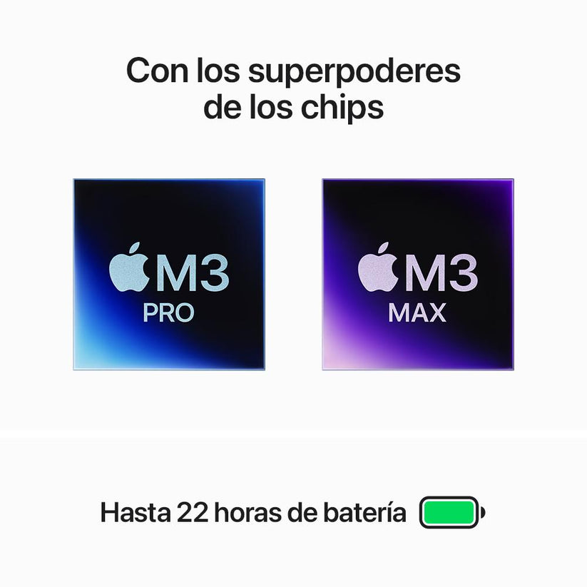 HASTA 22 HORAS DE BATERÍA — Gracias a la eficiencia energética del chip de Apple, la batería te sigue el ritmo todo el día. Además, el MacBook Pro ofrece el mismo rendimiento increíble cuando está conectado a la corriente o funcionando con la batería.